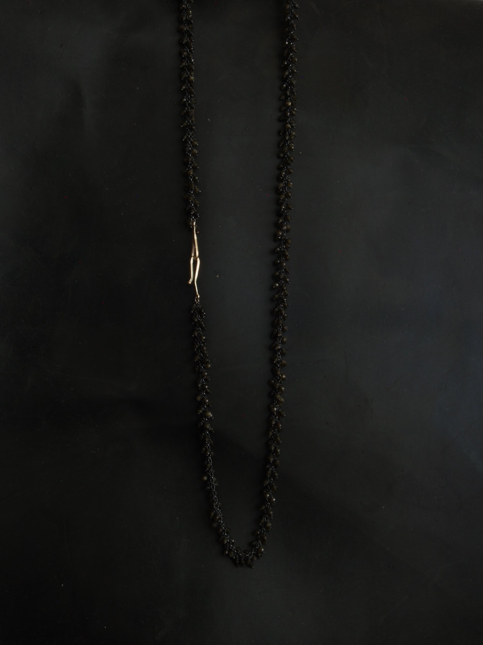 Tiny, intricately faceted beads trace long, graceful lines in oxidised silver, finished with radiant gold clasps designed to draw energy from the sun.