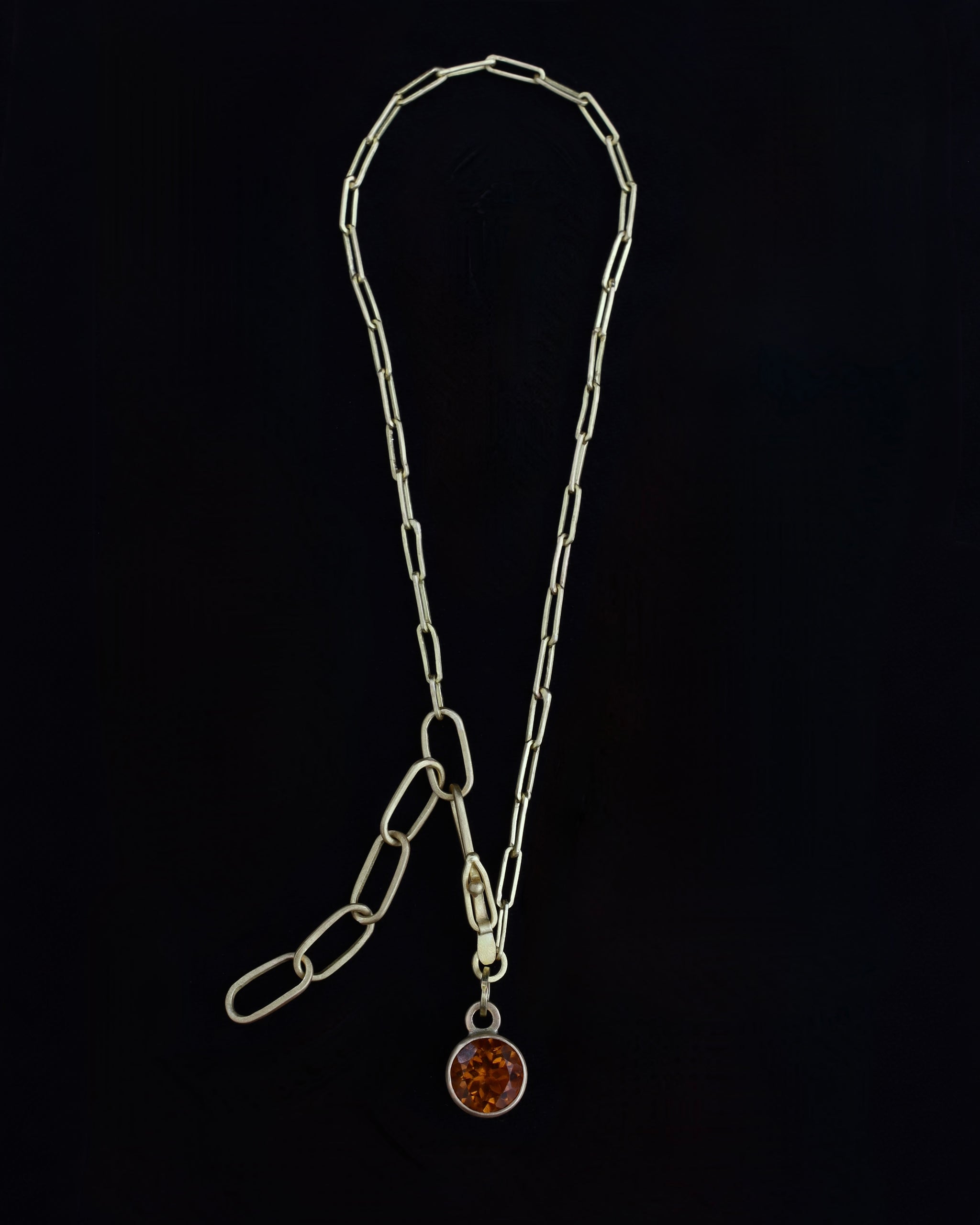 A brilliant-cut Madeira citrine, set in a softly rounded bezel hangs from hand made chain.