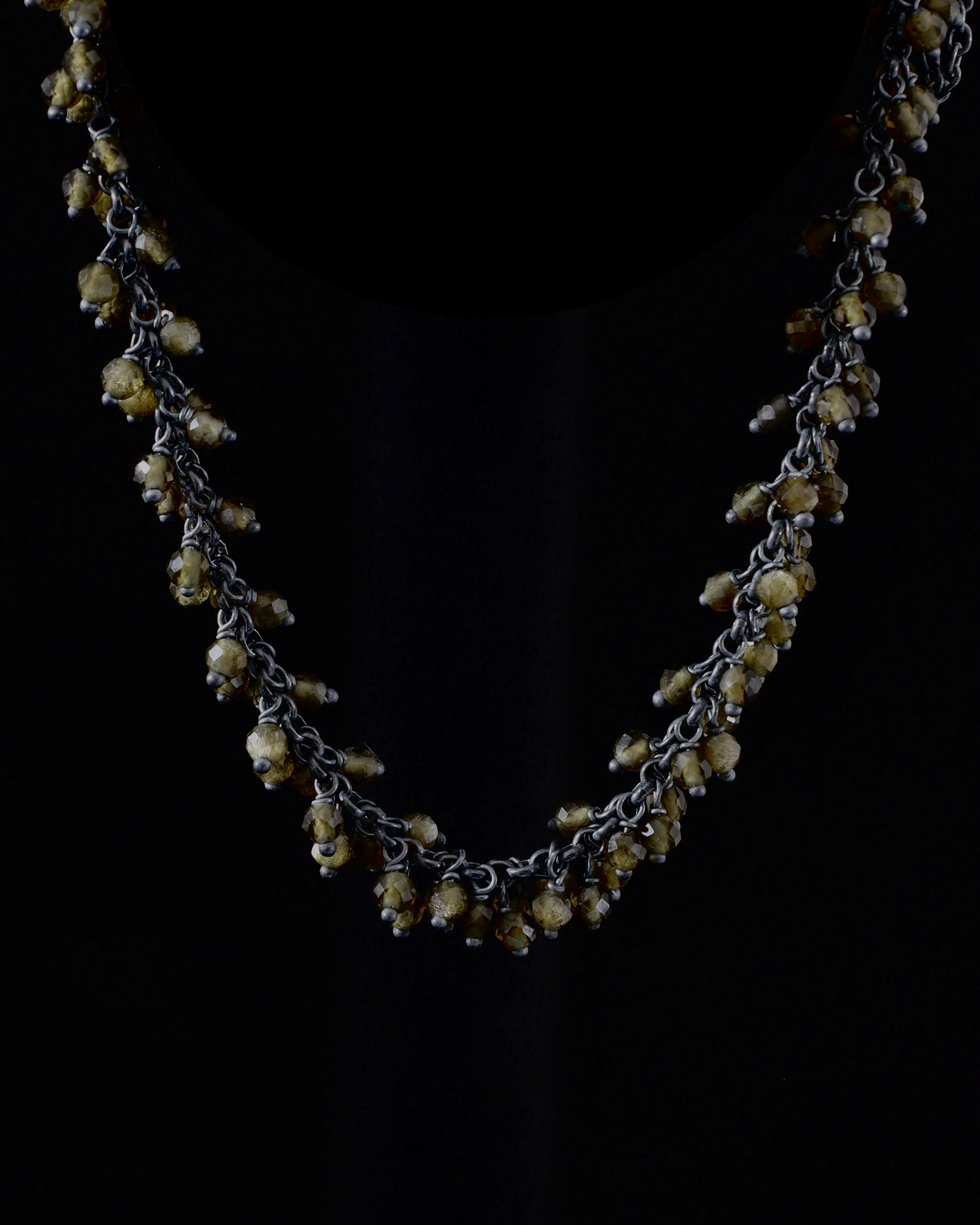 Microfaceted golden obsidian beads are handcrafted with oxidised sterling silver to create a fluid and enticingly sparkly bracelet. With the option of a 9ct gold or sterling silver hook and eye clasp, all made by hand in my London studio.